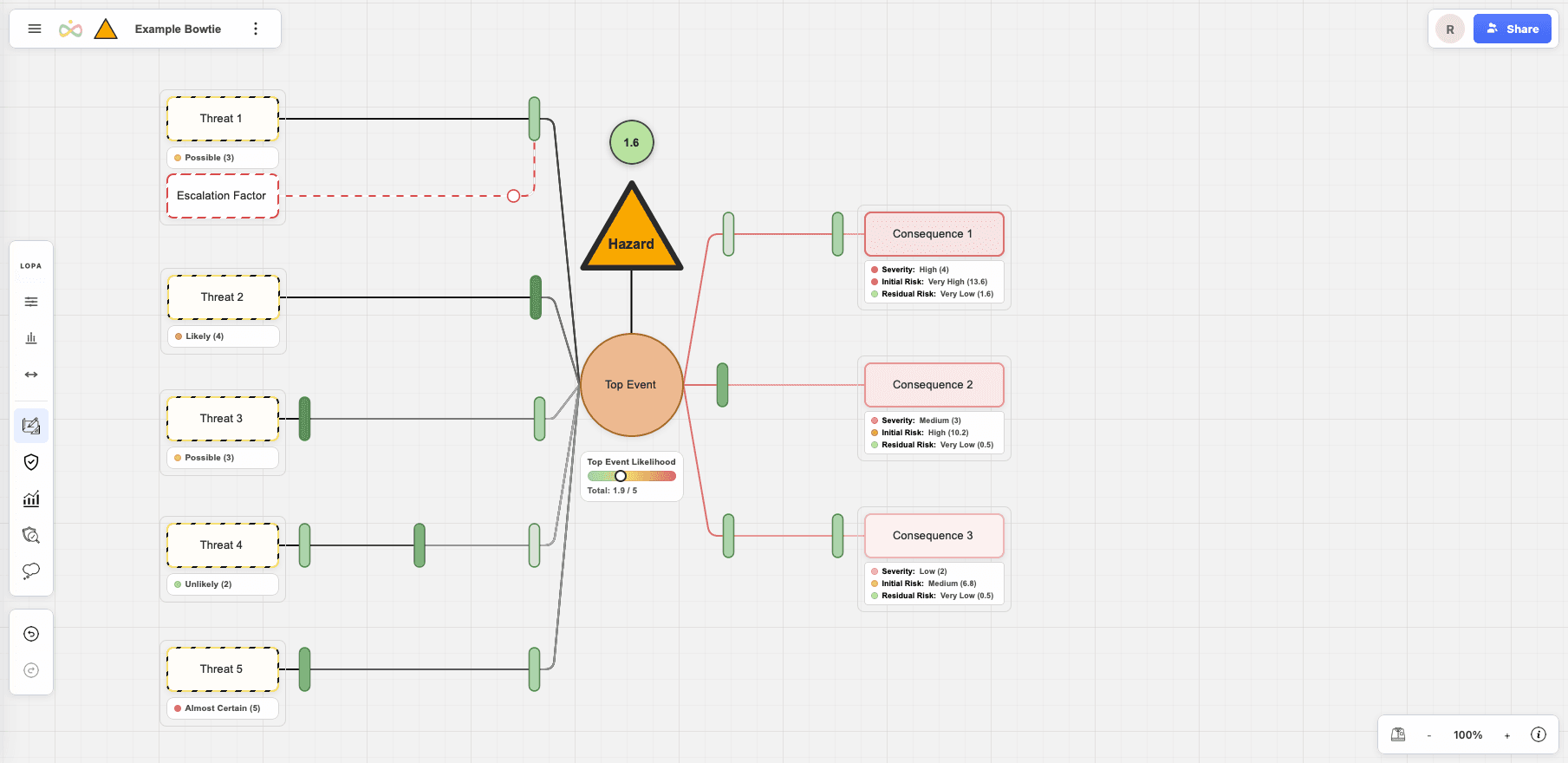 Build, analyze, and communicate risk using interactive bowtie diagrams and LOPA modeling. Map hazards, threats, safeguards, and consequences in a visual workspace built for real safety and risk engineering.
