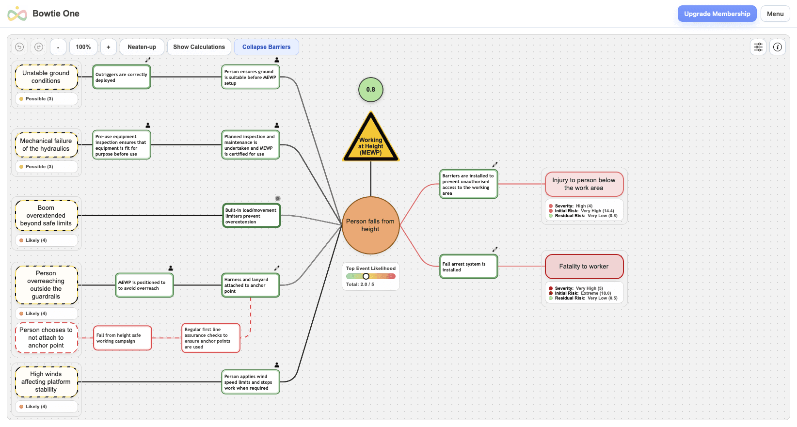 Build interactive bowtie diagrams that map hazards, threats, safeguards, and consequences — with built-in barrier reliability scoring.